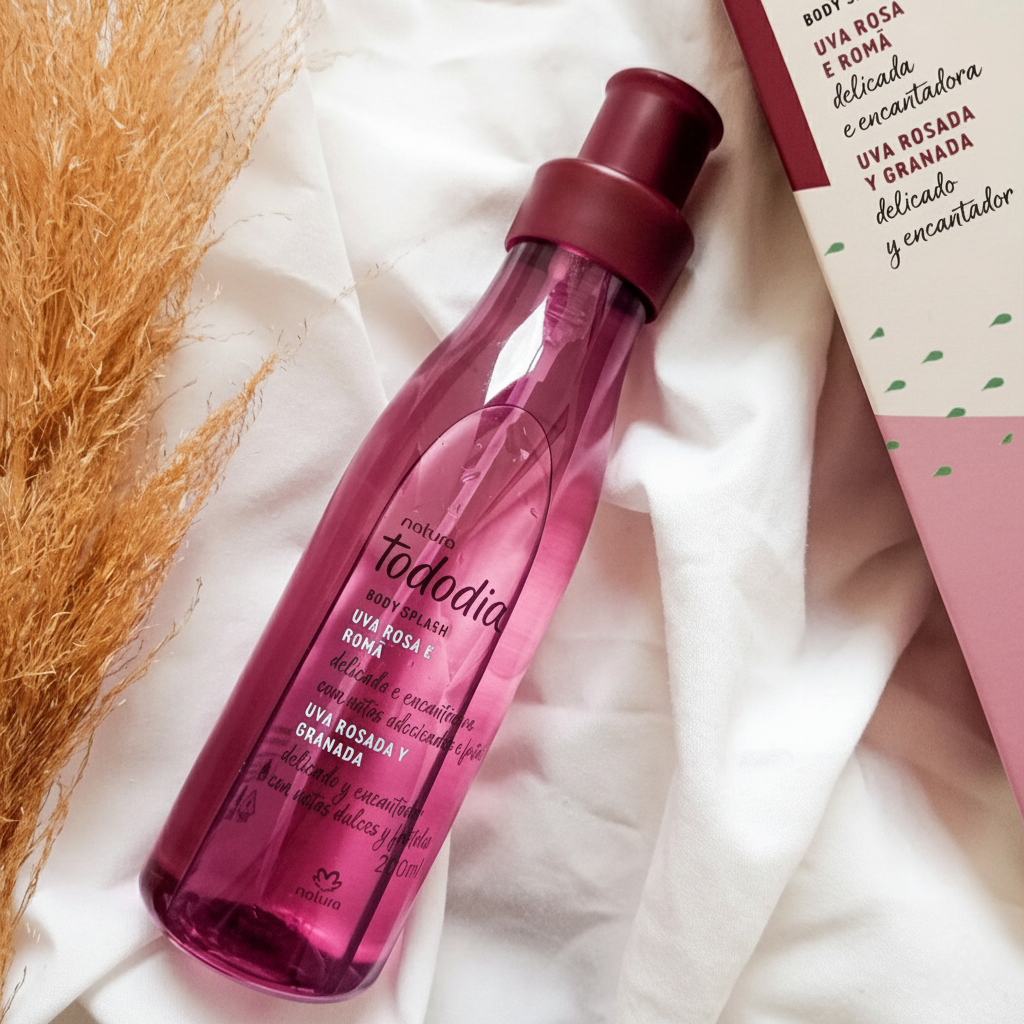 Una fragancia frutal dulce y vibrante que envuelve la piel con un aroma jugoso y femenino. El Body Splash Uva Rosada y Granada combina la frescura de las frutas con un fondo suave y dulce, creando una perfumación ligera pero deliciosa, ideal para acompañarte todos los días.