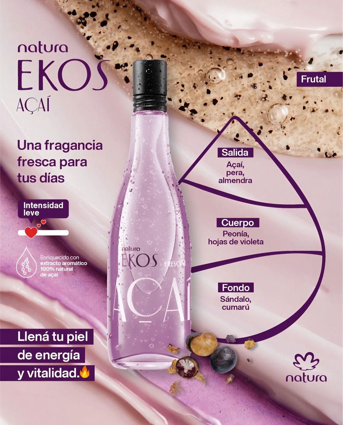 Ekos Frescor Açaí es una fragancia frutal fresca y envolvente inspirada en la energía del Amazonas. Combina la jugosidad del açaí con un corazón floral delicado y un fondo cálido que deja la piel suavemente perfumada. Es un aroma alegre, ligero y natural, ideal para quienes disfrutan fragancias frutales con un toque cremoso y reconfortante.