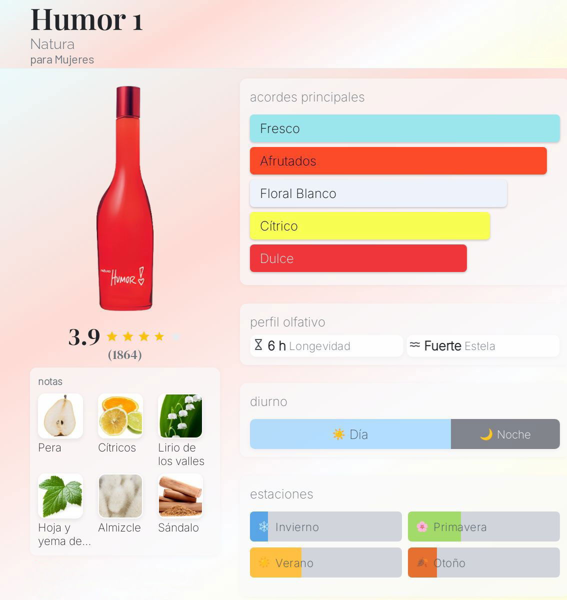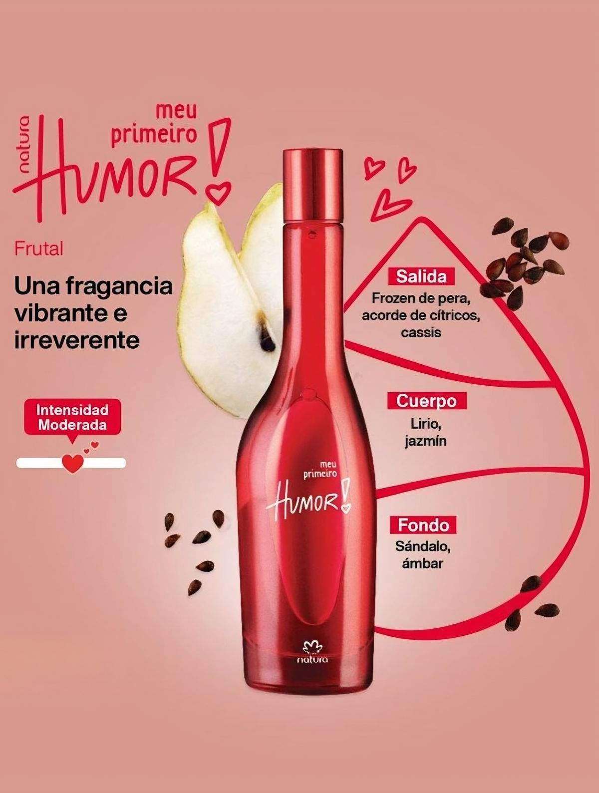 Humor Meu Primeiro es una fragancia frutal delicada y luminosa, inspirada en la dulzura de los primeros momentos especiales. Su salida fresca y jugosa de pera helada, acordes cítricos y cassis aporta una sensación alegre y vibrante; el corazón floral de lirio y jazmín suma feminidad y suavidad; mientras que el fondo de sándalo y ámbar envuelve la piel con un toque cálido y elegante.