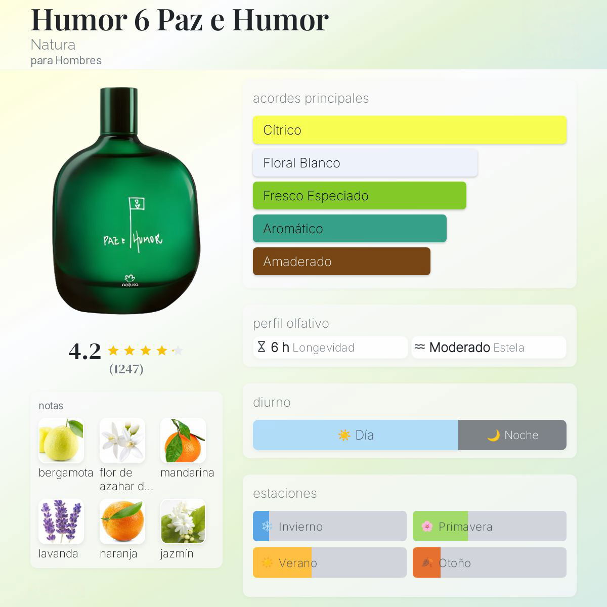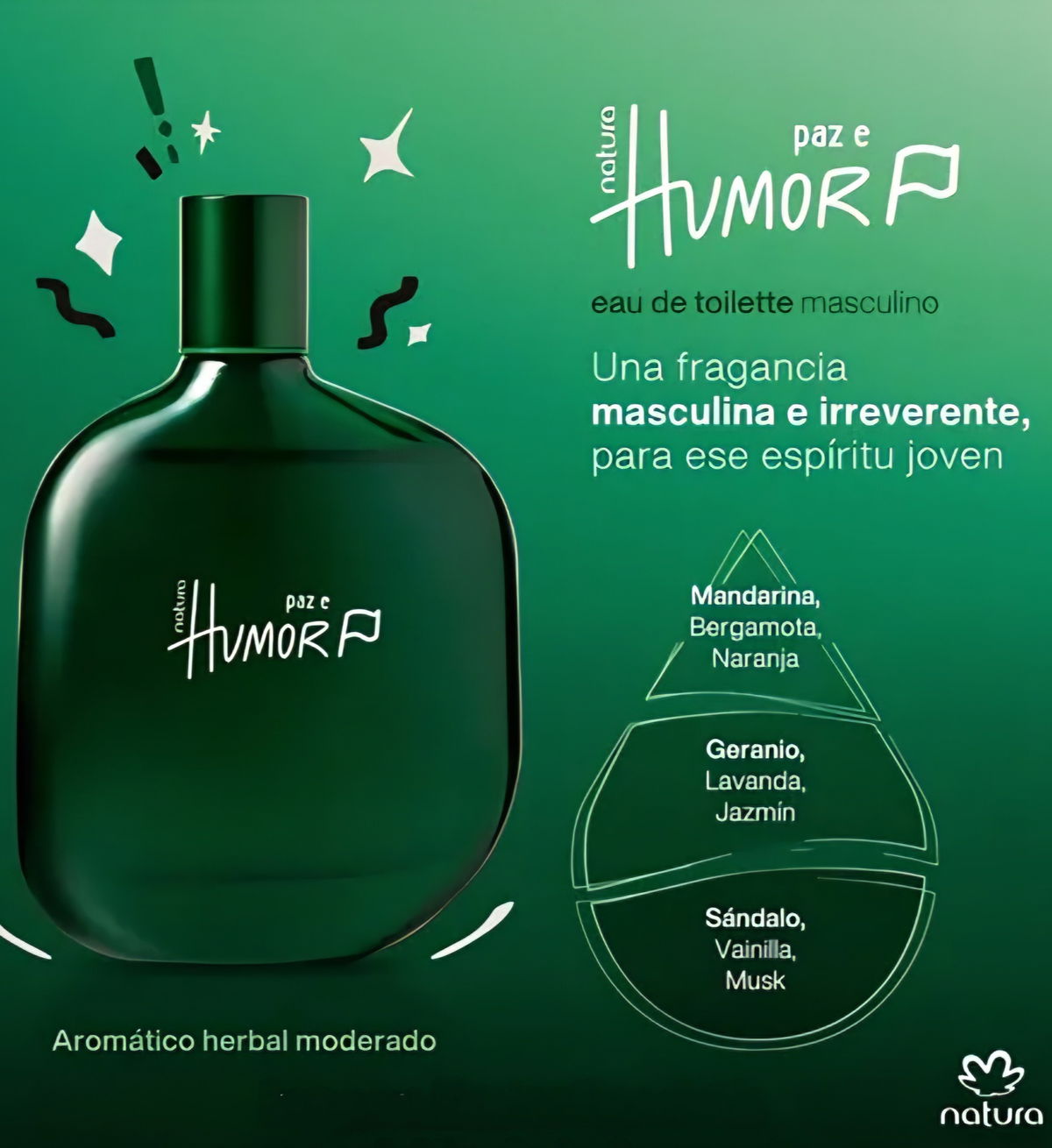 Una fragancia que transmite equilibrio, frescura y tranquilidad. Humor Paz es un aromático herbal ideal para el uso diario, con un aroma fresco y relajado que acompaña sin ser invasivo. Perfecto para quienes buscan un perfume versátil que funcione tanto para el día a día como para momentos informales.