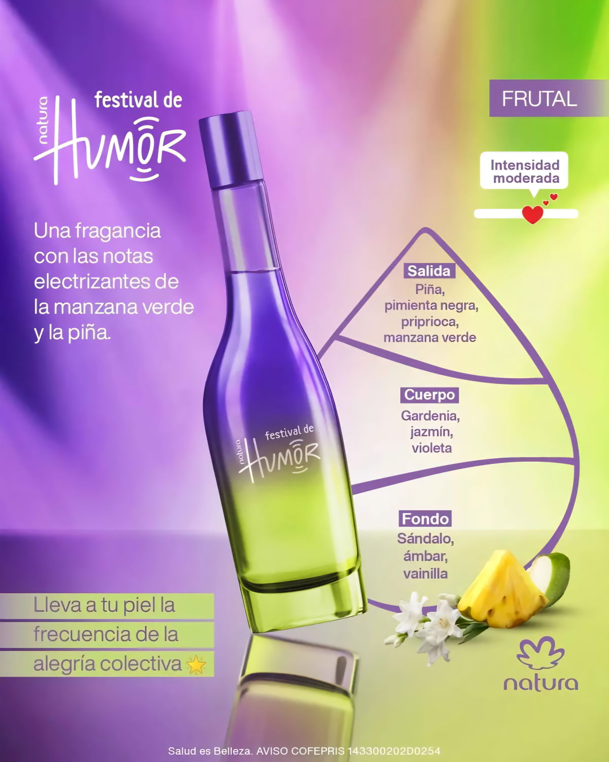 Una fragancia que vibra con la alegría colectiva, inspirada en la energía contagiosa de los festivales. Con notas chispeantes de manzana verde y piña, se mezcla con un corazón floral y una base cálida de sándalo, ámbar y vainilla. Creada con tecnología exclusiva de Natura que capta moléculas del aire durante los festivales y las transforma en un acorde olfativo único.