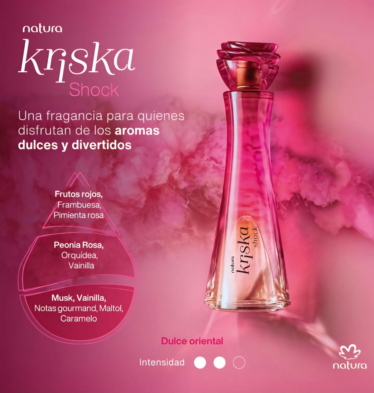 Una fragancia que te sumerge en un universo rosa, dulce y atrevido. Kriska Shock es alegría en forma de perfume: divertida, femenina y con ese toque gourmand que enamora desde el primer spray.