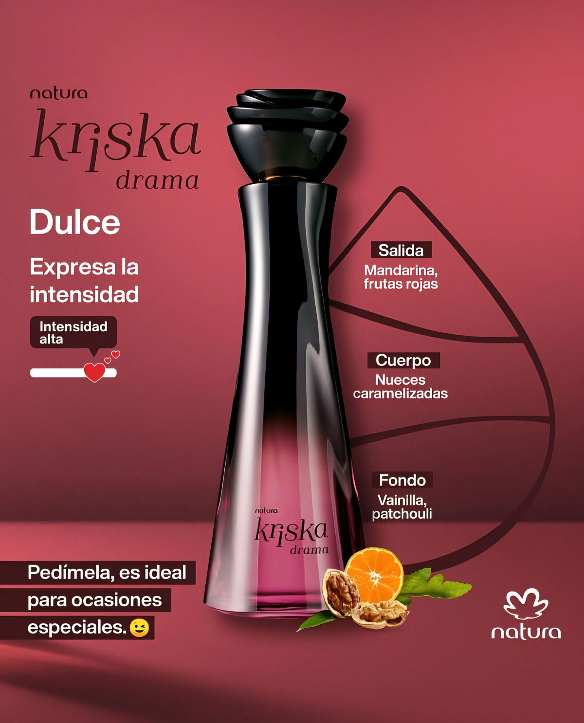 Para las que aman lo dulce... pero con intensidad. Kriska Drama es una fragancia que combina el encanto del azúcar derretido y las nueces carameladas con la cremosidad de la vainilla y un fondo levemente amaderado. Un perfume que mezcla dulzura y carácter, ideal para mujeres auténticas que se expresan con arte y emoción.