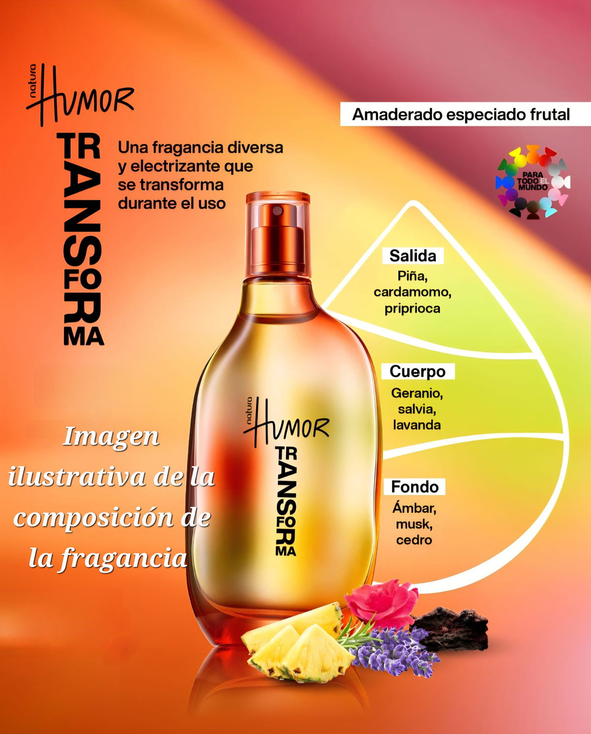 Querés una fragancia fresca y versátil para tu día a día, con un toque de originalidad? El Body Splash Humor Transforma es ideal para acompañarte con su frescura frutal, su costado amaderado suave y ese punto especiado que le da personalidad sin resultar invasivo.