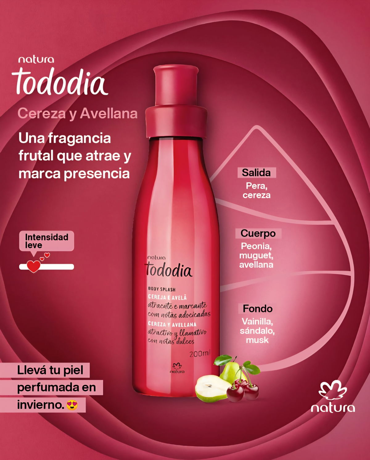 Buscás una fragancia suave que te abrace con dulzura y te haga sentir mimada todos los días? El Body Splash Cereza y Avellana es perfecto si amás los aromas delicadamente dulces, con un toque cremoso y envolvente.