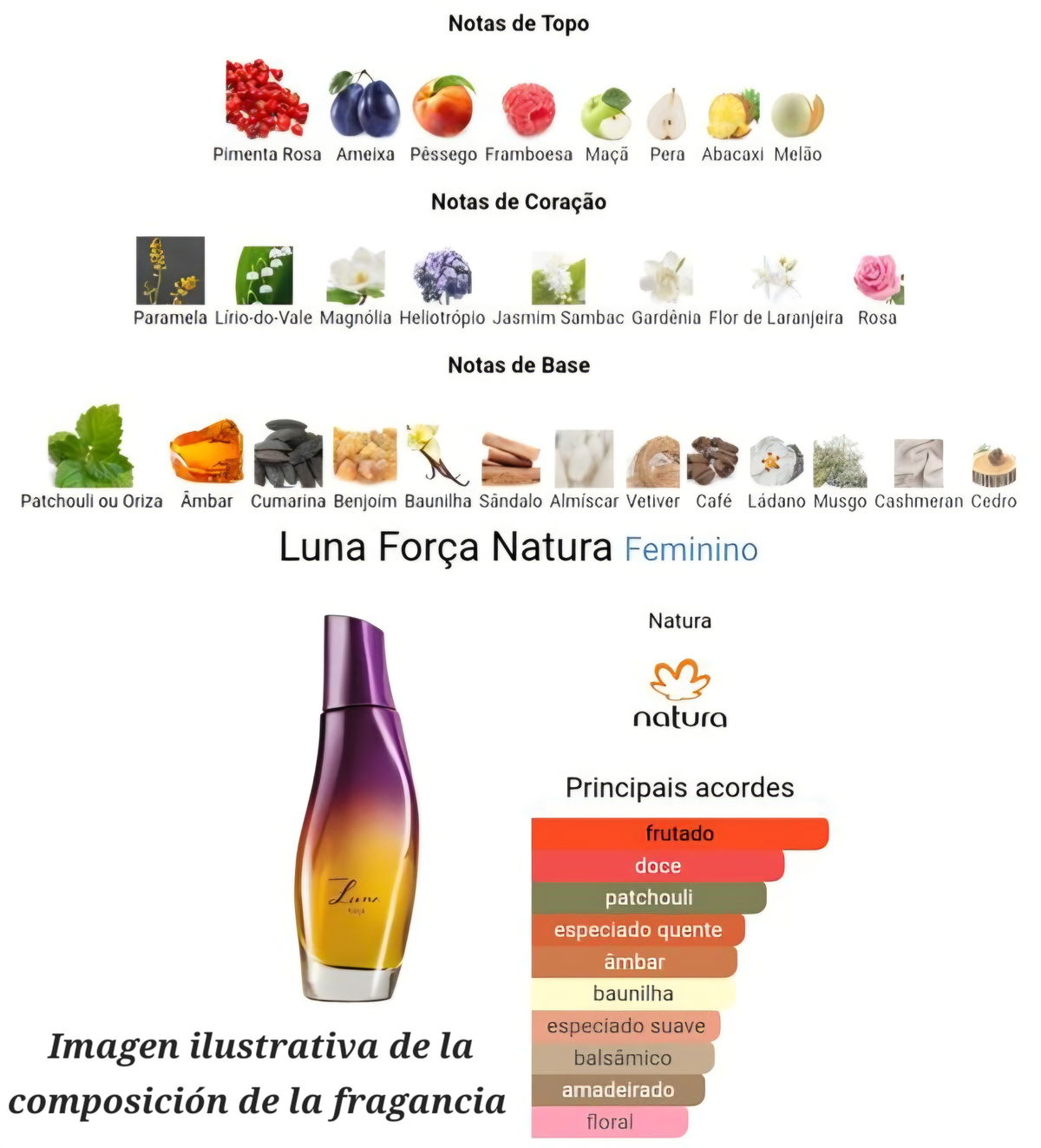 🍓 Notas presentes: pimienta rosa, ciruela, durazno (pêssego), frambuesa, manzana, pera, ananá (abacaxi), melón (melão), paramela, lirio del valle, magnolia, heliotropo, jazmín sambac, gardenia, flor de azahar, rosa, patchouli, ámbar, cumarina, benjuí, vainilla, sándalo, almizcle, vetiver, café, ládano, cashmeran, cedro