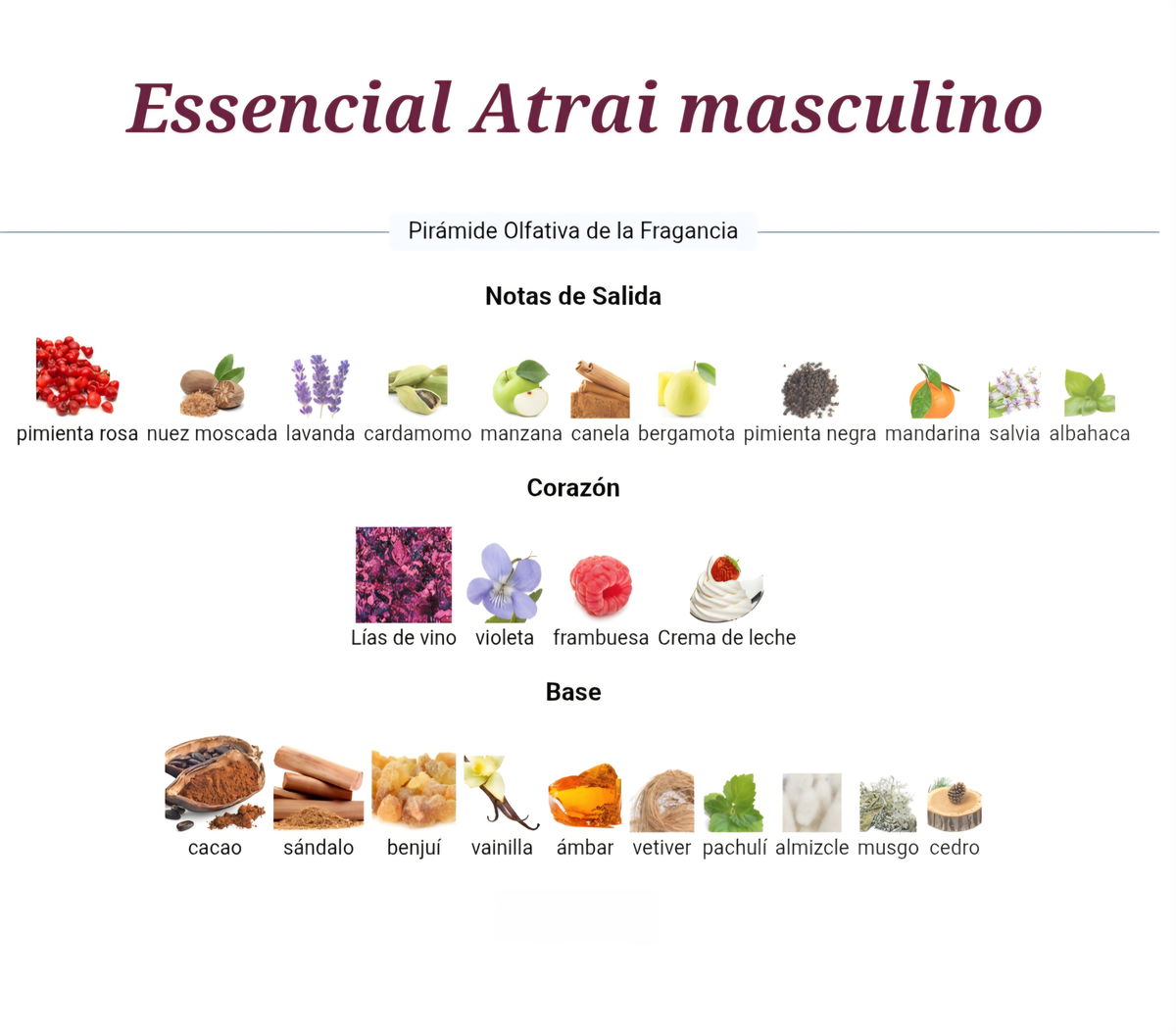 🌳 Notas de fondo: cacao, sándalo, benjuí, vainilla, ámbar, vetiver, pachuli, almizcle, musgo, cedro