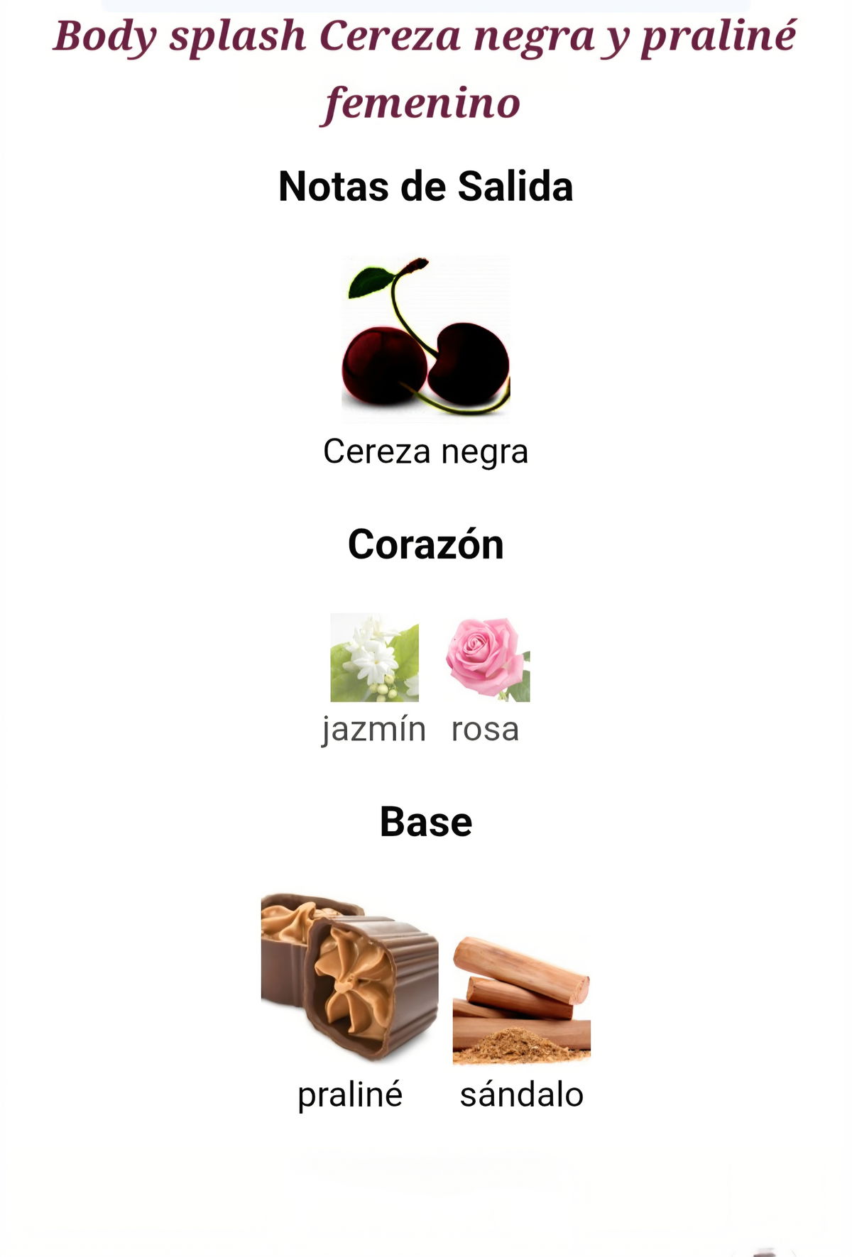 Dulce, envolvente y adictivo. El Body Splash Cereza Negra y Praliné es perfecto si amás las fragancias cálidas con un toque gourmand y sofisticado. Su aroma combina la intensidad jugosa de la cereza negra con la cremosidad del praliné, todo sobre un fondo floral y amaderado suave que acaricia la piel 🖤