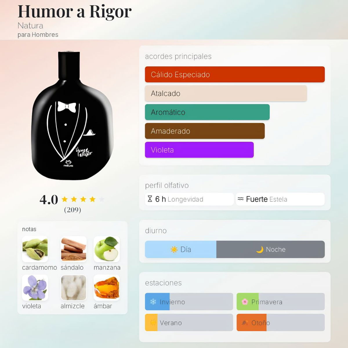 Elegante, cálido y con un toque especiado, Humor a Rigor es ideal si buscás un perfume que combine frescura inicial con un fondo sofisticado y envolvente. Su salida de cardamomo, manzana y pomelo aporta energía y modernidad, mientras que el corazón floral y suave se equilibra con un fondo amaderado y ambarado que transmite seguridad y estilo