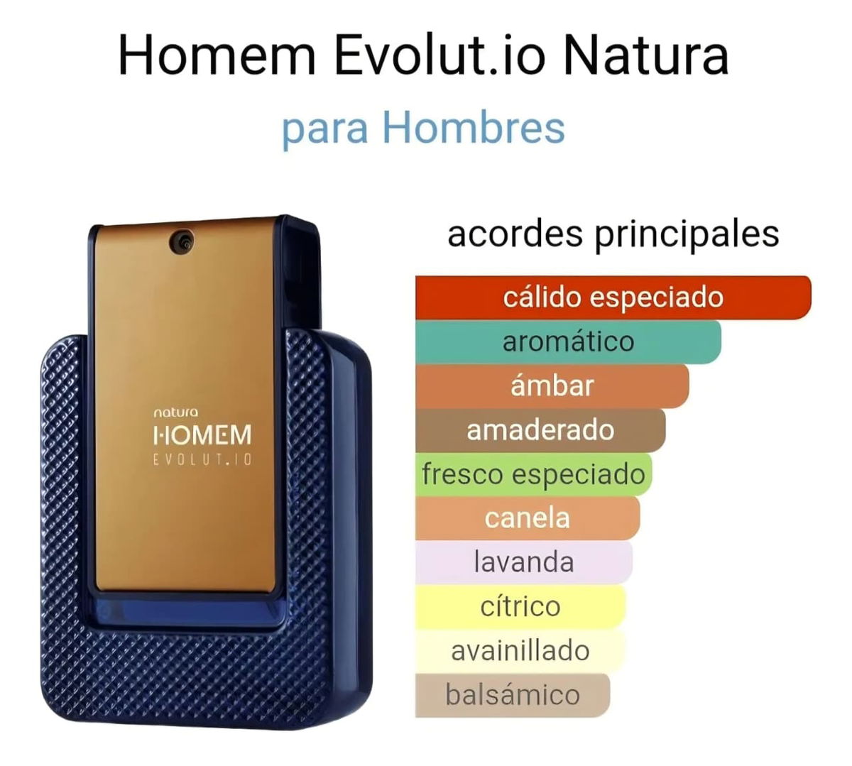 Moderno, intenso y con personalidad, Homem Evolut.io es un eau de parfum amaderado ámbarado que combina frescura aromática con especias vibrantes y un fondo cálido y envolvente. La salida cítrica y herbal se mezcla con un corazón especiado y lleno de energía, para luego dar paso a una base profunda y elegante que transmite confianza y sofisticación. Ideal para quienes buscan un aroma masculino impactante y duradero.