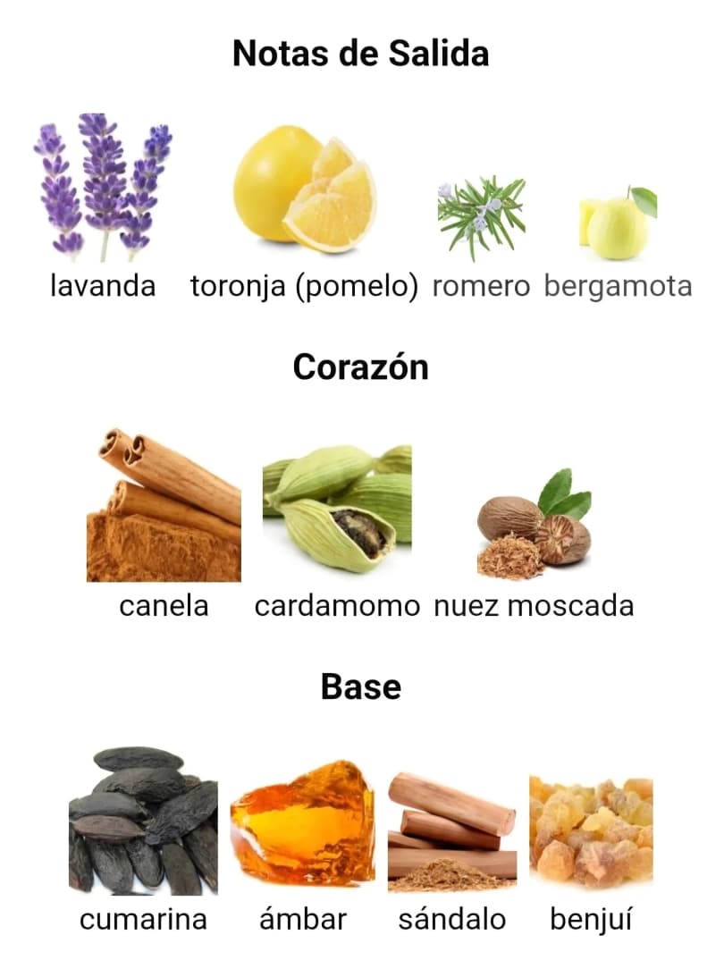 🌸 Notas de corazón: Canela, cardamomo, nuez moscada