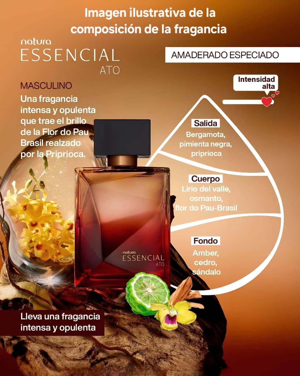 🍊 Notas presentes: Bergamota, pimienta negra, priprioca, lirio del valle, osmanto, flor do pau-brasil, ámbar, cedro, sándalo