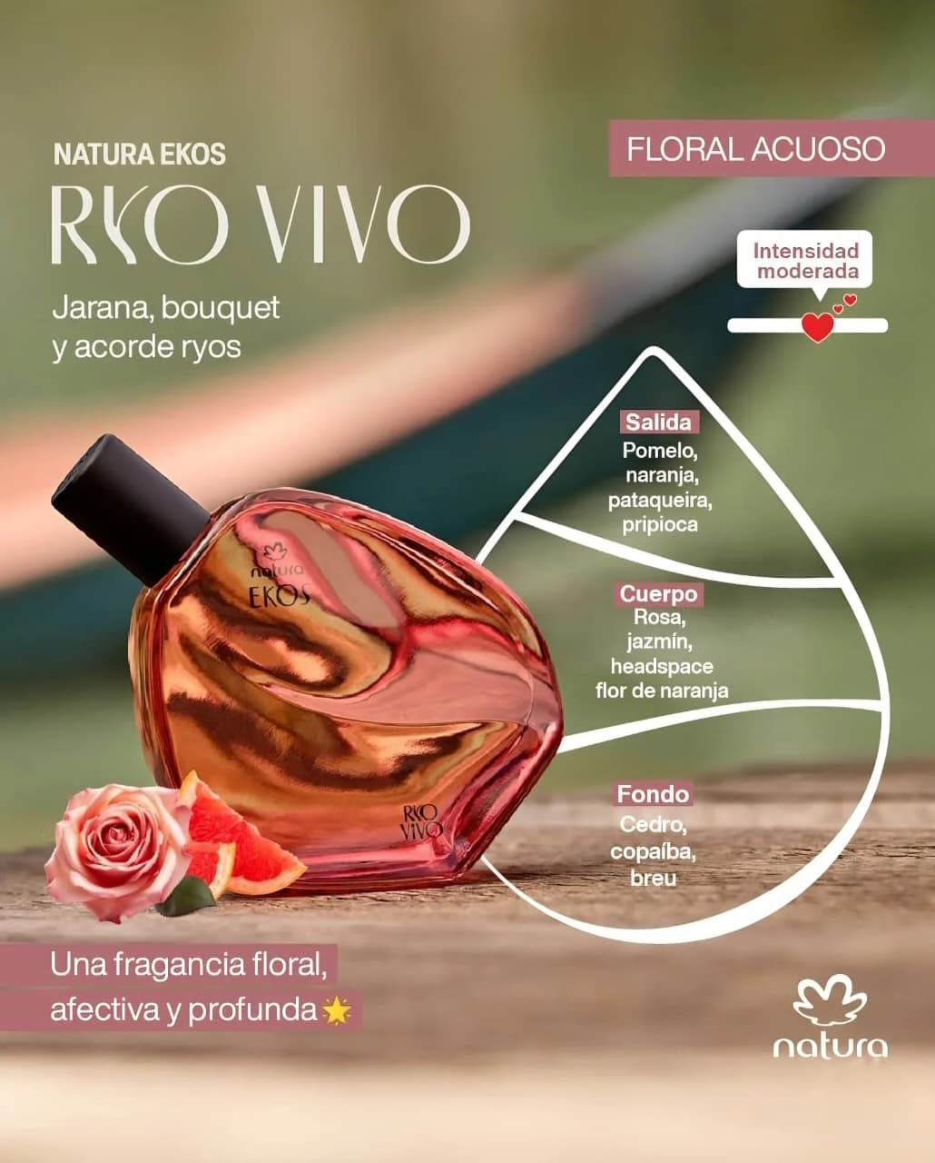 Ekos Ryo Vivo es un eau de toilette floral acuoso que combina notas cítricas y amaderadas con toques florales amazónicos. Una fragancia ligera pero envolvente, que transmite vitalidad y frescura en cada aplicación, ideal para quienes buscan un aroma versátil y natural.