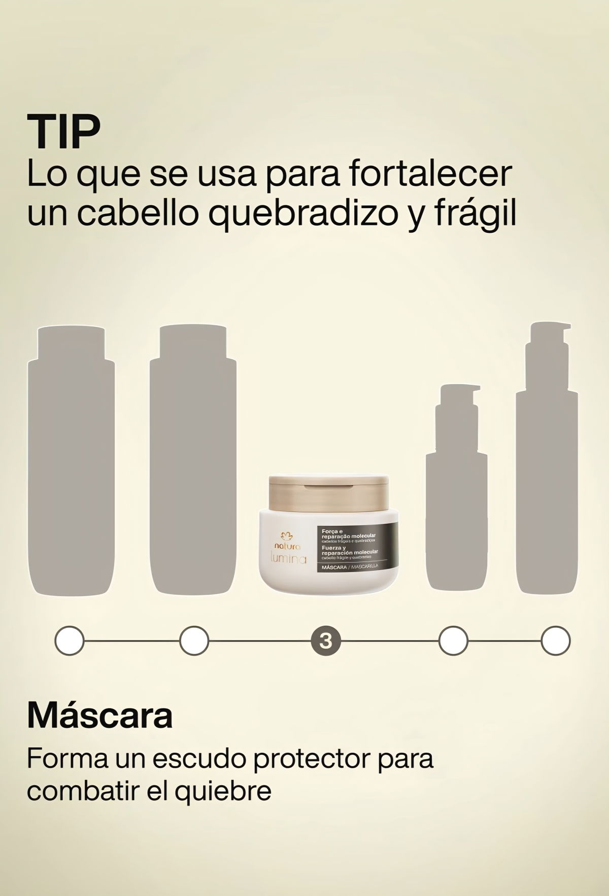 Esta máscara repara y protege los enlaces internos a nivel molecular, recuperando la masa capilar dañada y formando un escudo que combate el quiebre sin dejar el cabello pesado. Su uso progresivo potencia los resultados, logrando 5x más fuerza y protección contra daños futuros desde la primera aplicación 😍
