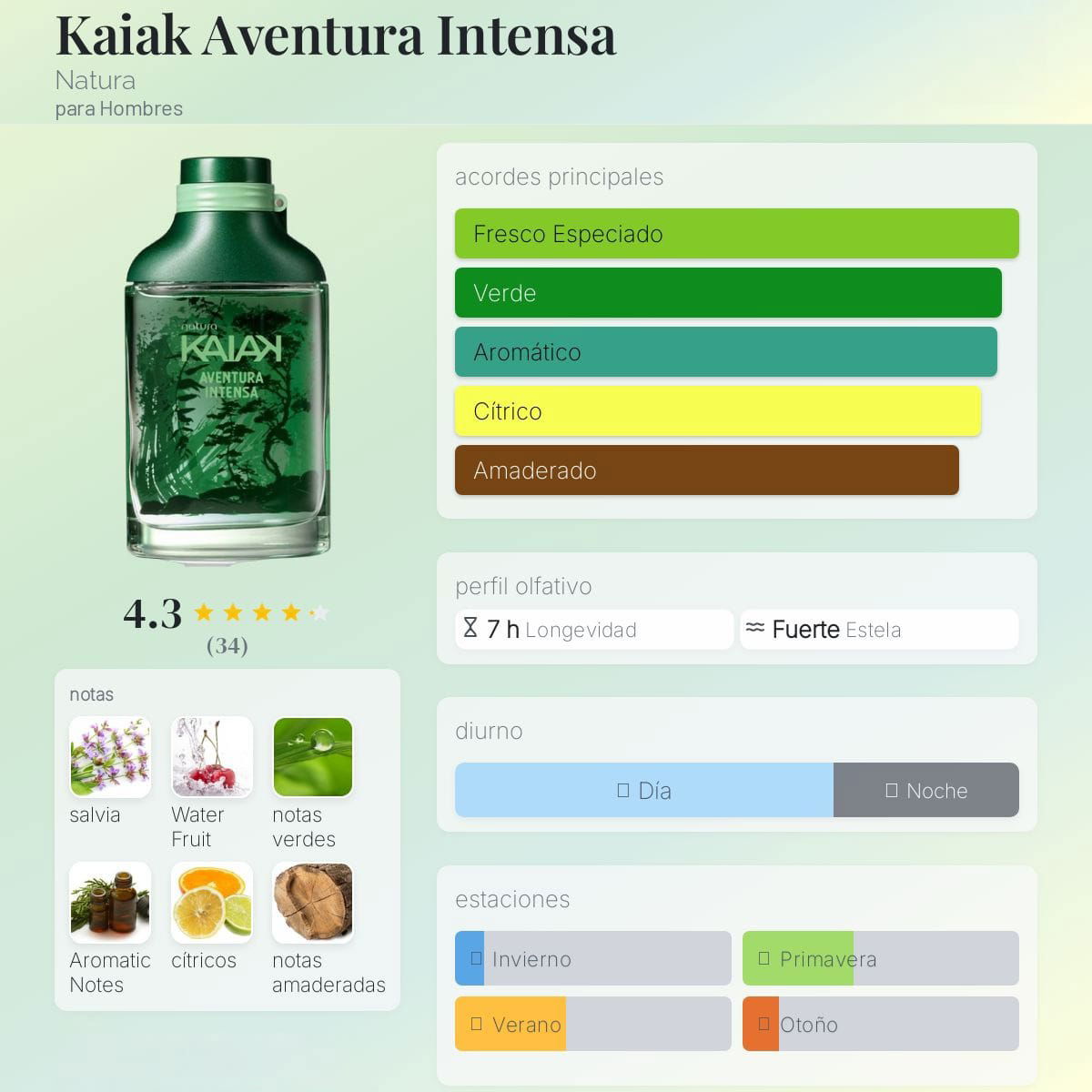 💡 Dato: A diferencia de Kaiak Aventura Clásico, que es aromático herbal con notas de bergamota, casis y pimienta negra sobre un fondo de ámbar, sándalo y almizcle, Kaiak Aventura Intensa se destaca por su costado más frutal y acuático, con un aire moderno, limpio y muy fácil de llevar.