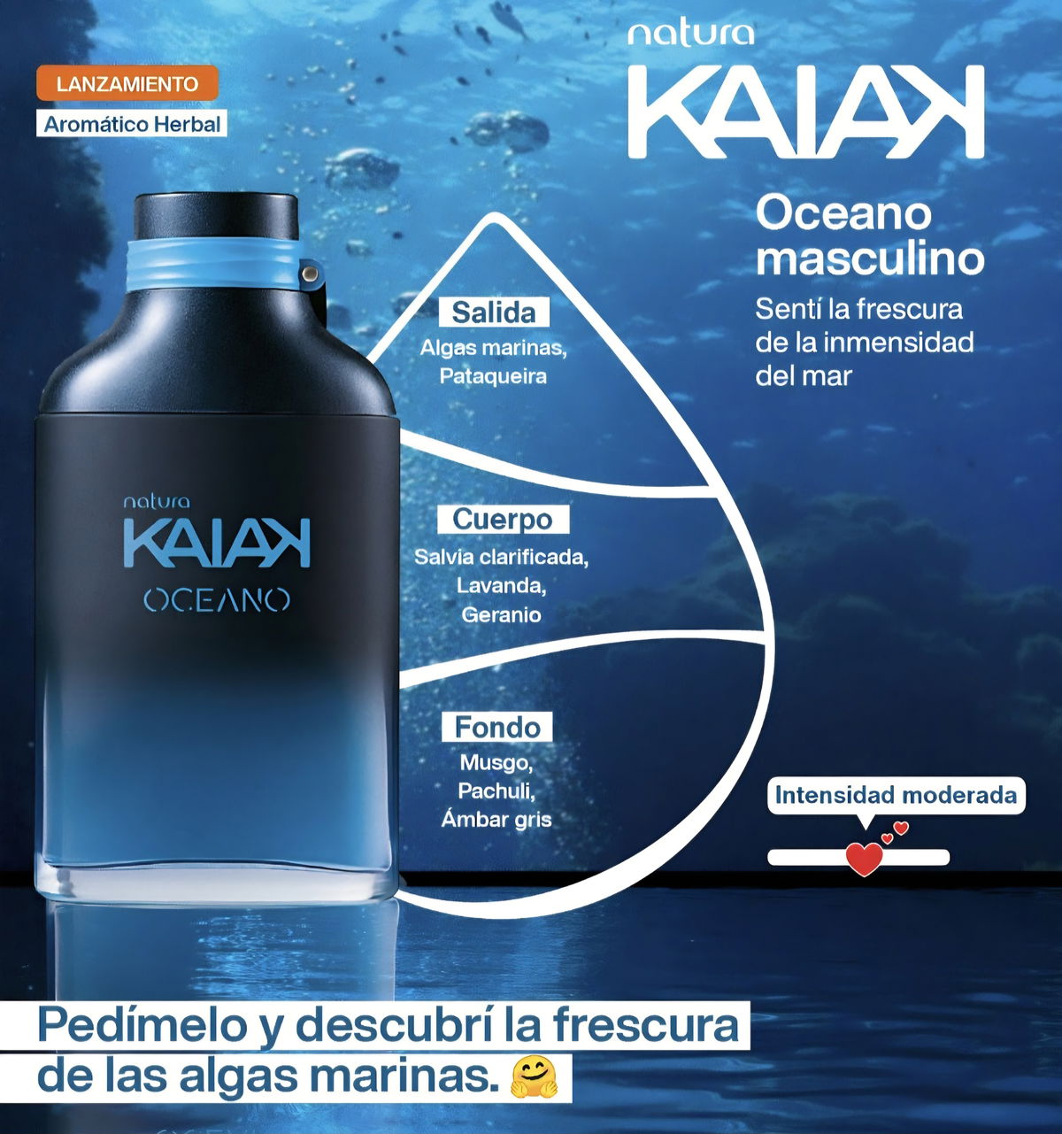 Kaiak Oceano es una fragancia aromática herbal que transmite libertad, frescura y vitalidad. Su salida combina algas marinas y pataqueira, evocando el aire salado del océano. En el corazón, la salvia clarificada, lavanda y geranio aportan un toque limpio y elegante, mientras que el fondo de musgo, pachulí y ámbar gris deja una estela cálida, envolvente y naturalmente masculina.