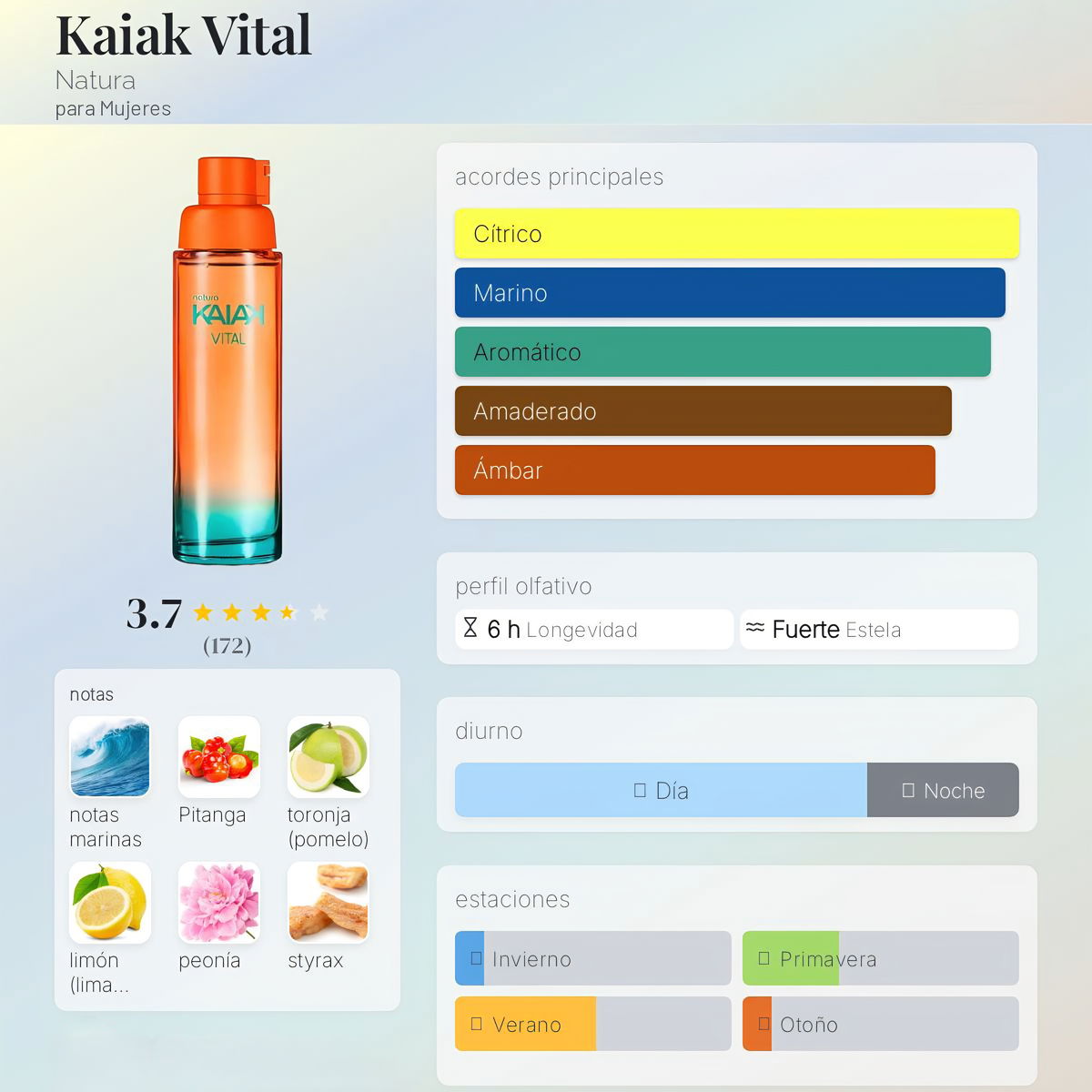 Kaiak Vital Femenino es una fragancia floral de intensidad moderada que transmite vitalidad y movimiento, inspirada en la frescura del océano y la energía de la naturaleza. Su salida combina la luminosidad del limón, el pomelo y la pitanga, que se funden con un corazón de acorde marino, rosa y jazmín, evocando una sensación revitalizante.