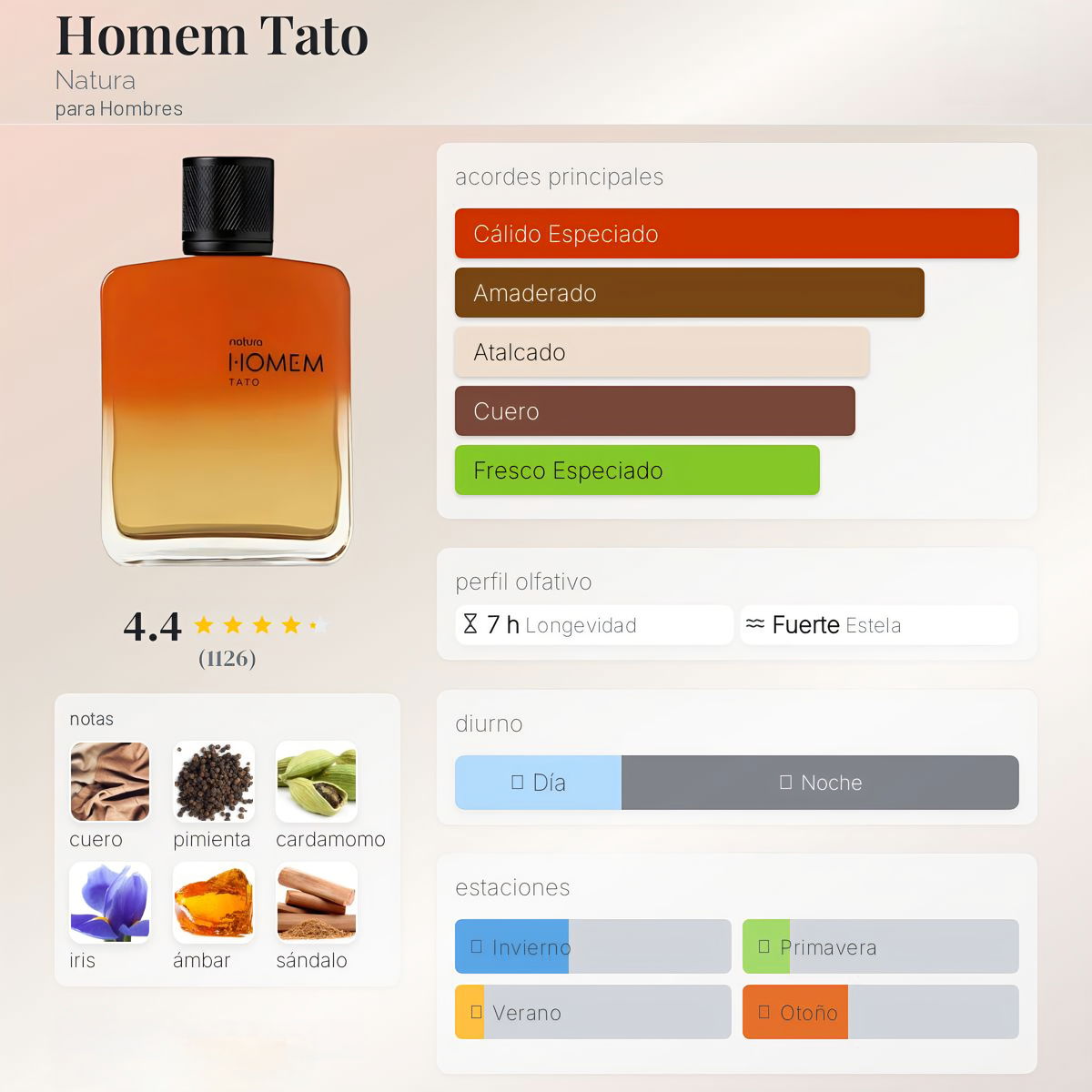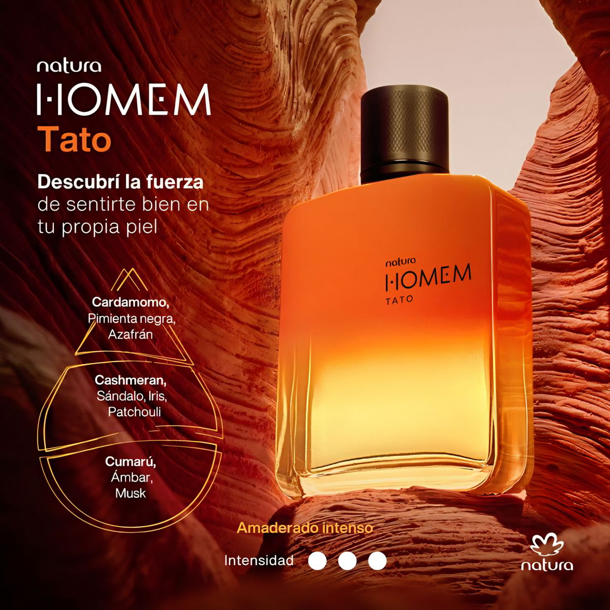 Homem Tato es una fragancia amaderada intensa que combina fuerza, calidez y sofisticación. Su salida de cardamomo, pimienta negra y azafrán aporta una energía especiada y vibrante; el corazón de cashmeran, sándalo, iris y pachulí le da profundidad y textura; mientras que el fondo de cumarú, ámbar y musk deja una estela envolvente y marcadamente masculina.
