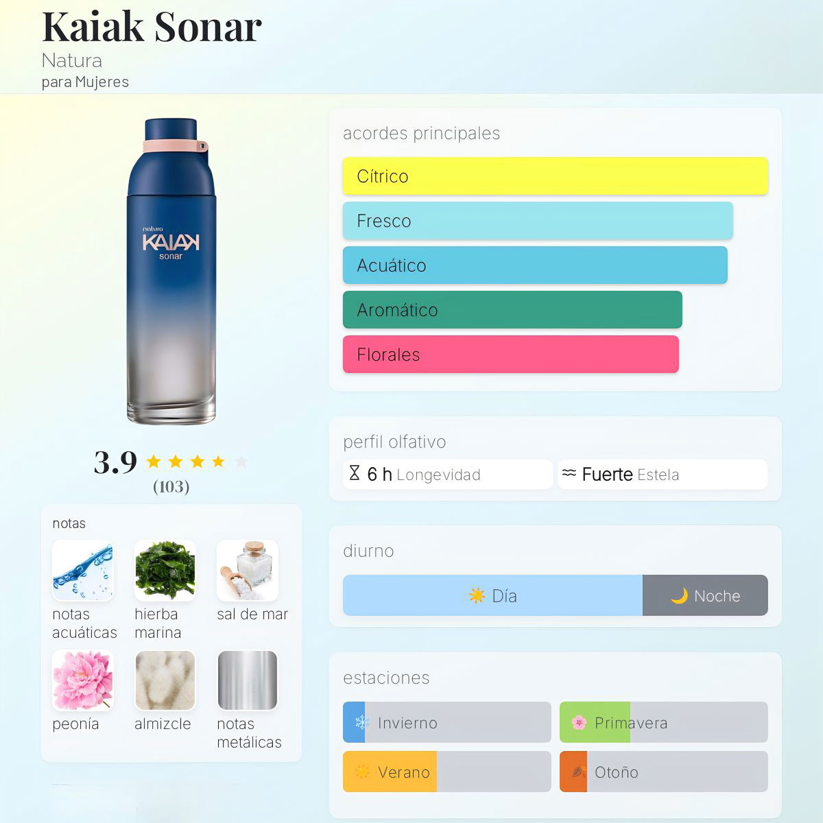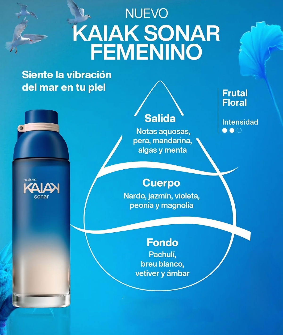 El Kaiak Sonar Femenino es una fragancia frutal floral que evoca la libertad del océano y la conexión con el movimiento del agua. Su salida combina notas acuosas, pera, mandarina, algas y menta, que aportan una frescura vibrante. En el corazón, nardo, jazmín, violeta, peonía y magnolia revelan un costado floral elegante y femenino, mientras el fondo de pachulí, breu blanco, vetiver y ámbar brinda profundidad y calidez.
