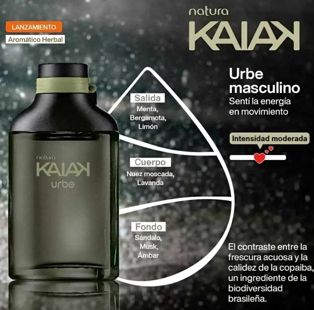 El Kaiak Urbe Masculino es una fragancia aromática herbal que combina vitalidad y frescura con un toque cálido y envolvente. Su salida mezcla menta, bergamota y limón, aportando una sensación refrescante inmediata. El corazón de nuez moscada y lavanda suma elegancia y equilibrio, mientras el fondo de sándalo, musk y ámbar deja una estela suave y duradera.
