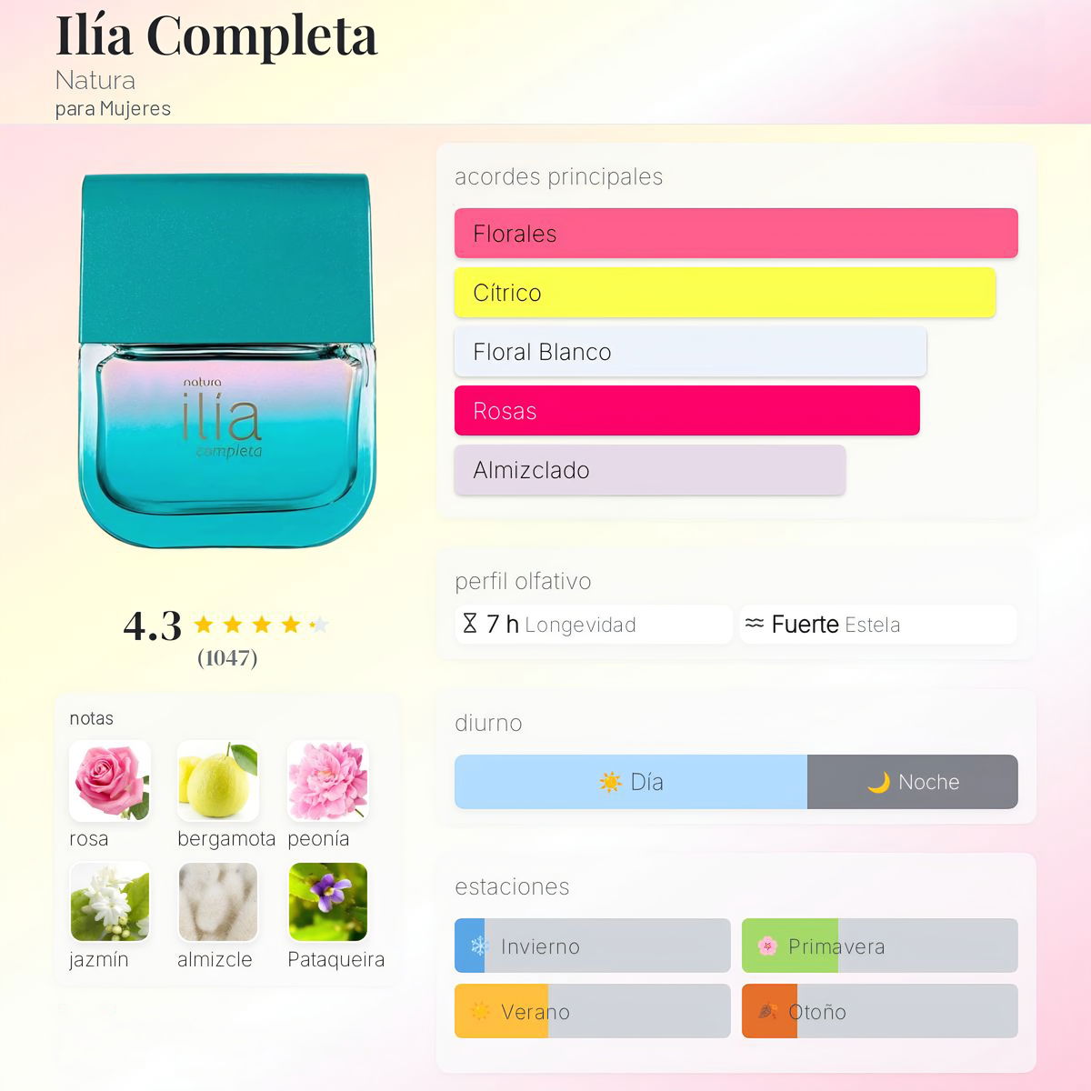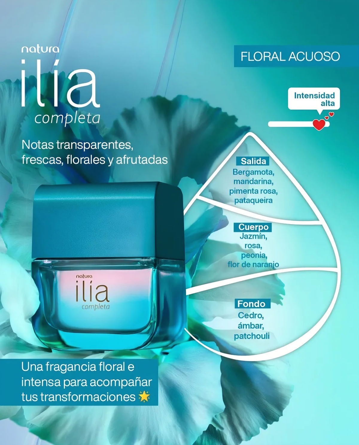 El Ilía Completa Eau de Parfum es una fragancia floral acuosa que celebra la fuerza y sensibilidad femenina en perfecta armonía. Su salida fresca de bergamota, mandarina y pimienta rosa con pataqueira despierta los sentidos, mientras su corazón floral de jazmín, rosa, peonía y flor de naranjo aporta suavidad y feminidad. El fondo de cedro, ámbar y patchouli deja una estela cálida y sofisticada que equilibra frescura y profundidad.