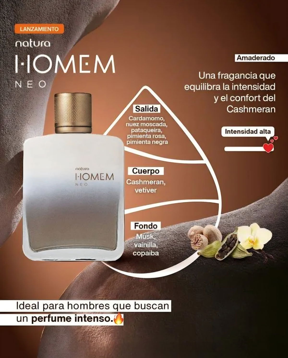 El Homem Neo Eau de Parfum es una fragancia amaderada que combina notas especiadas intensas con un fondo cálido y sensual. Su salida de cardamomo, nuez moscada, pataqueira, pimienta rosa y pimienta negra aporta energía y sofisticación, mientras el corazón de cashmeran y vetiver le da textura y profundidad. El fondo de musk, vainilla y copaíba envuelve la piel con una estela cálida, moderna y envolvente.